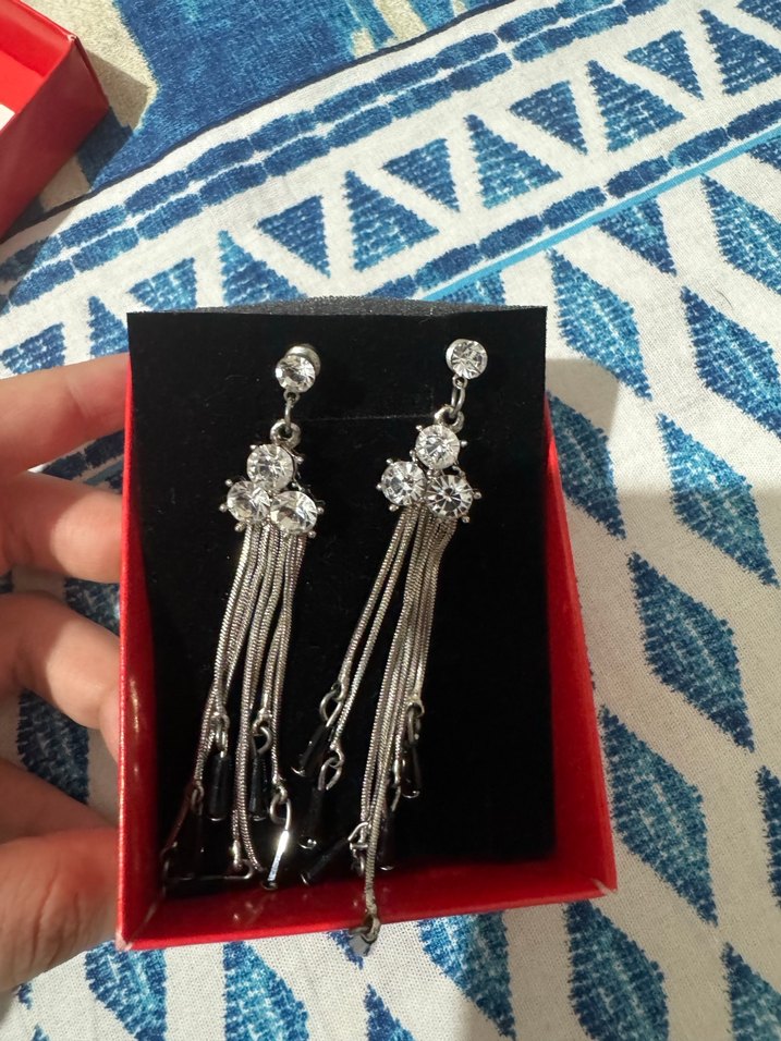 Gri midi uzunlukta, taşlı ve püsküllü küpeler, bohem ve klasik şıklığı bir araya getirir, düğün gibi özel günler için uygundur.