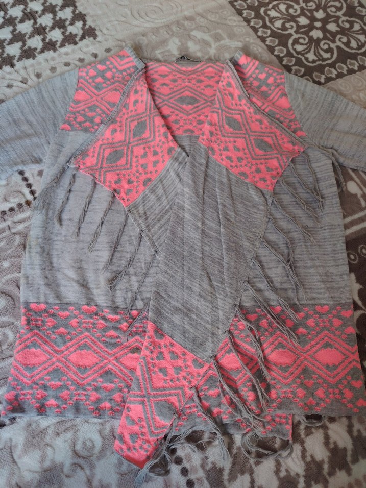 Çok küçük bir delik ve sol tarafta z bi sartı var son fotoda gösterdim M ve L bedene rahatlıkla olur salaş kesimdir. Kadınlar için örgü dokulu, gri zemin üzerine canlı pembe geometrik desenler ve püsküllerle tamamlanmış bohem tarzda şal tarzı hırka