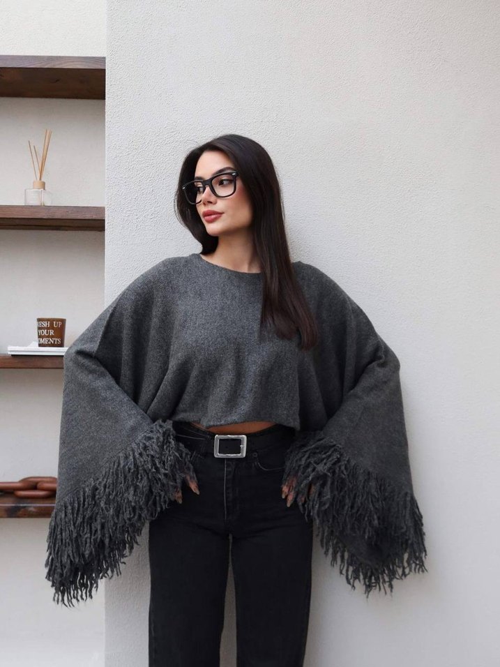 Gri yün kumaştan, salaş kesim ve püsküllü etnik desenli uzun kollu, günlük kullanıma uygun kadın kazak.