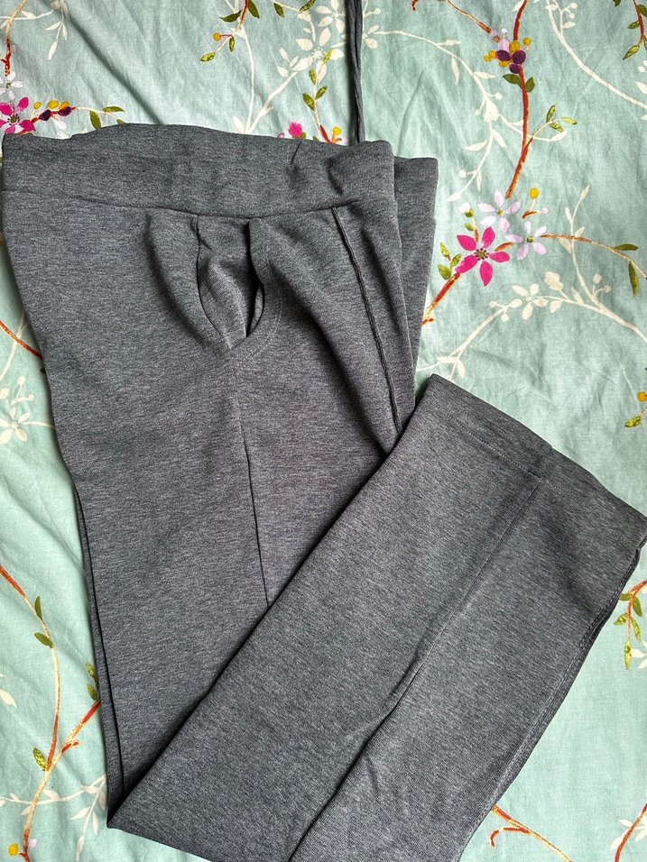 Gri renkte, rahat kesim ve normal midi boyda hamile iken kullandığım eşofman altı. Yumuşak sentetik kumaştan, fermuarlı ceplerle ve konforlu, sade tarzda.