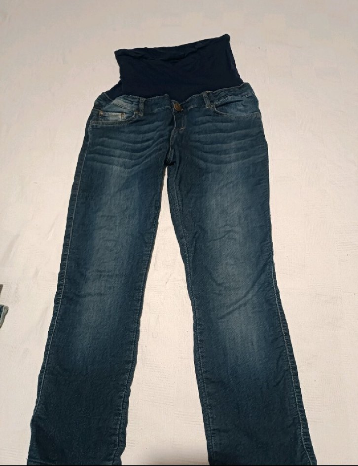 Gri yumuşak bel bantlı, mavi kot kumaştan, bol kesim ve normal boyda hamile pantolonu. Sokak stiline uygun, tokalı detaylı rahat model.