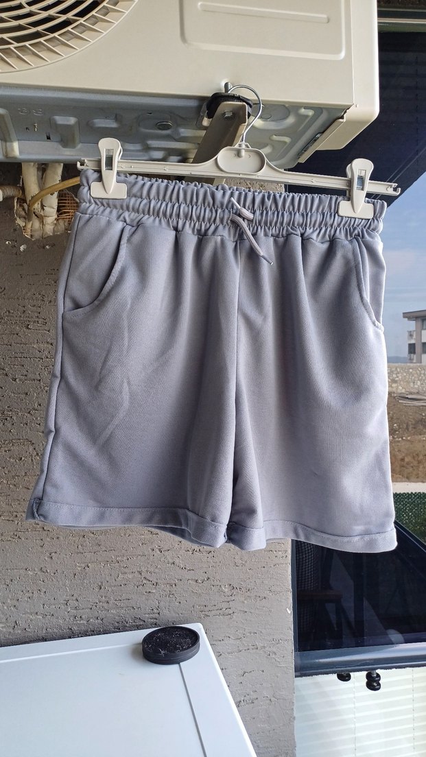 Gri renkte, bol kesim, yumuşak ve sıcak kumaştan, lastikli bel ve cepli hamile mini şort, rahat dış mekan kullanımı için ideal.