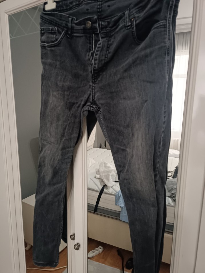 Gri renkte, bol kesim ve tokalı detaylı kot pantolon. Midi boy ve desen içermeyen tasarımıyla günlük sokak stiline uygundur. rengi tam siyah degl hafif solmuş fiyatı uygun tuttum