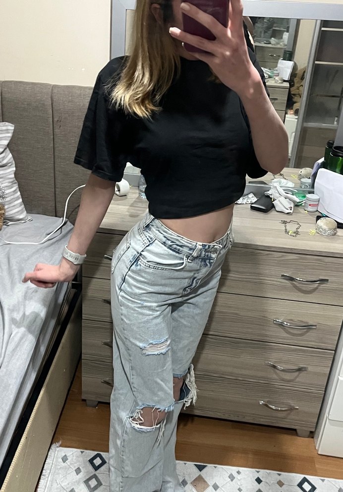 Yırtık detaylı, mavi renk rahat kesim bol paça denim kadın jean. Günlük kullanım için konforlu ve şık bir sokak stili görünümü sunar. Temiz