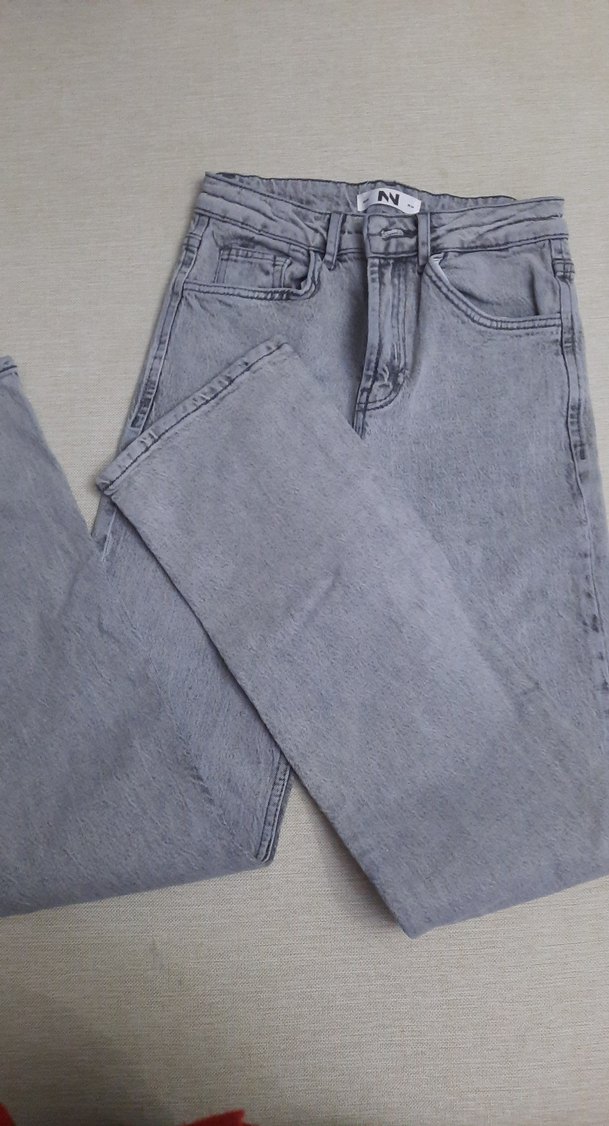 Gri renkli, rahat kesim ve normal boyda kadın denim pantolon. Günlük kullanıma uygun, sade ve şık tasarımıyla öne çıkar.