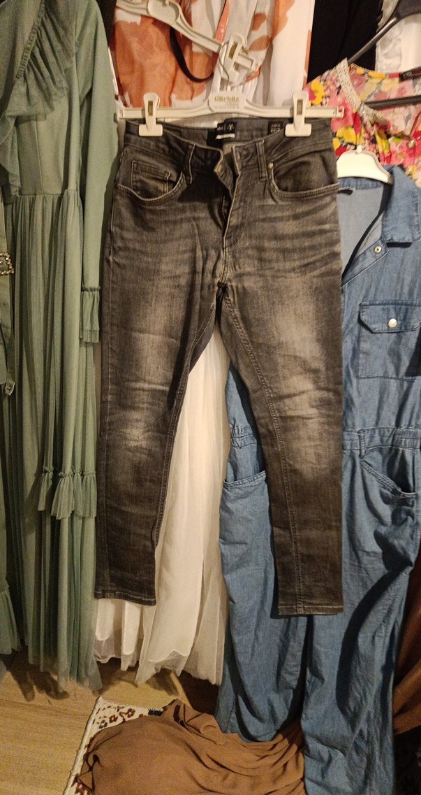 Gri renk, rahat kesim, kemer tokalı erkek denim pantolon. Günlük kullanım için uygun, sokak tarzı görünüm sunar.