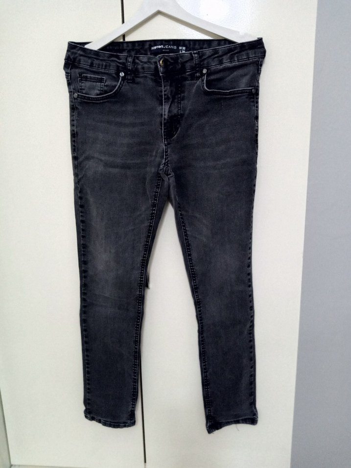 Gri renkte, rahat kesim ve normal boyda erkek denim pantolon. Günlük sokak stili için uygun ve şık görünümlü.