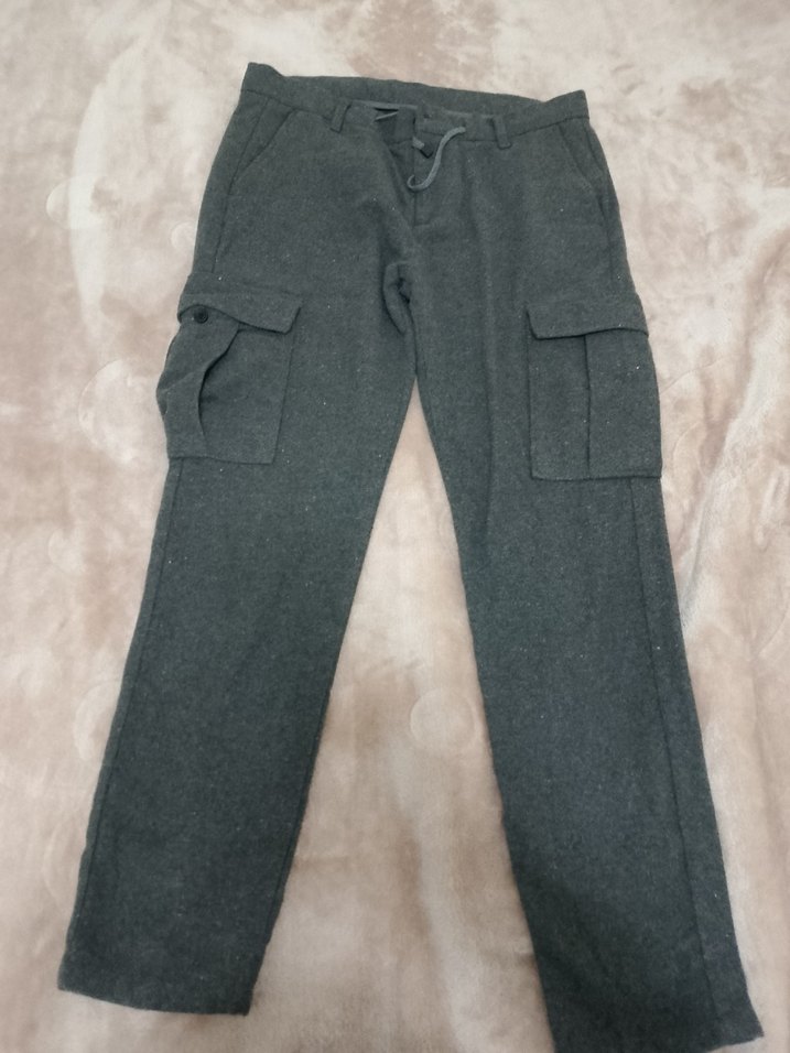 Düğmeli ceplere sahip gri, rahat kesim kumaş pantolon. Günlük kullanıma uygun, sıcak ve rahat midi boy sokak stili pantolon.