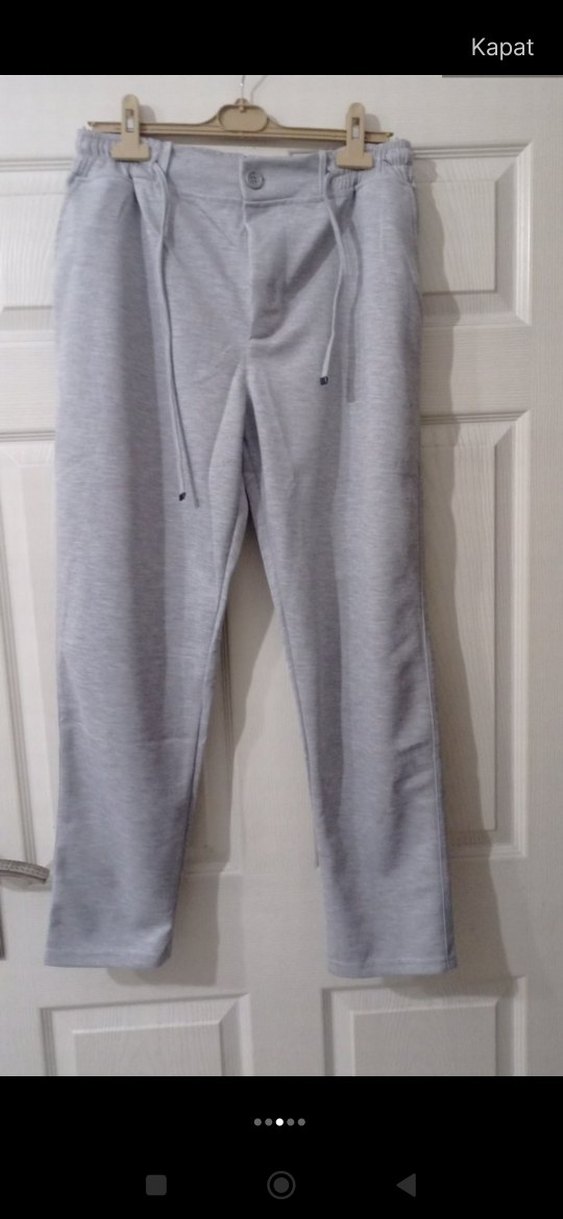 Yumuşak sentetik kumaştan, rahat kesim gri pantolon . Midi boy ve bağcıklı bel ile gündelik şıklık sağlar.
