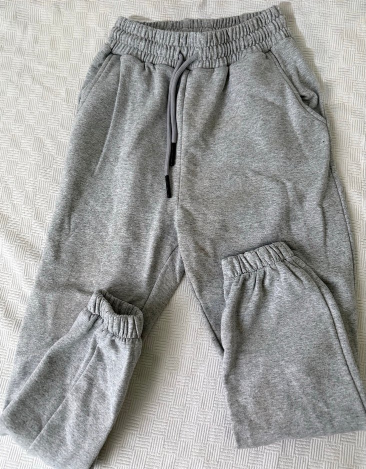 Yumuşak kumaştan, lastikli bel ve bağcıklı gri rahat kesim kadın eşofman altı. Günlük kullanım ve sokak stili için uygundur. ️