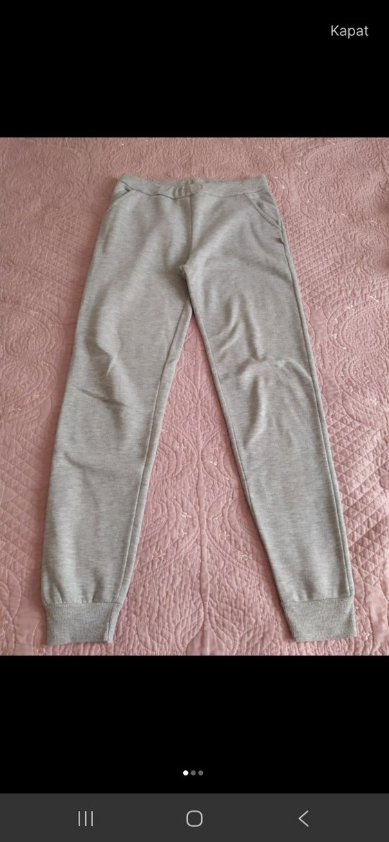 Gri renkte, rahat kesim ve normal boyda kadın eşofman altı. Yumuşak sentetik kumaştan, spor ve günlük şıklık için uygundur.