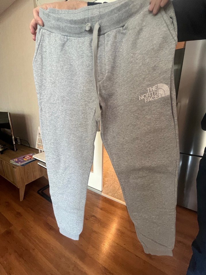 Gençler için gri renkli, rahat kesim ve normal boy eşofman altıdır. Lastikli bel ve yan cepler bulunur. The North Face orijinaldir. Sağ önde belirsiz sarı bir lekesi var .