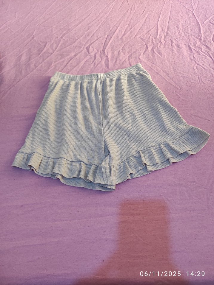 Gri renkli, rahat kesimli ve kısa boylu hamile şortları, etek ucunda fırfır detayına sahiptir. Nefes alan keten kumaştan üretilmiş, günlük kullanım için sade ve konforludur.