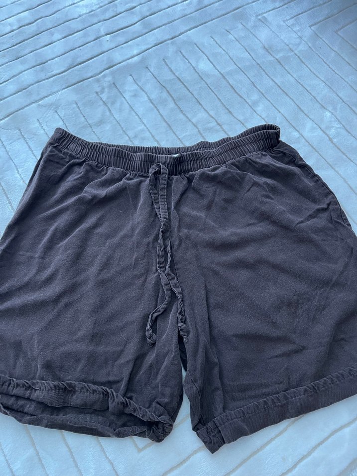 Gri renkte, rahat kesim ve bağcıklı bel detayına sahip hamile şortu. Yumuşak keten kumaştan, midi boy ve sade tasarımlı, dış mekan kullanımı için uygun.