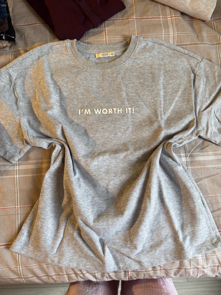 Nefes alabilir keten kumaştan yapılmış, kısa kollu, yuvarlak yaka, gri rahat kesim hamile tişörtü. Üzerinde "I'M WORTH IT!" yazısı bulunur.
