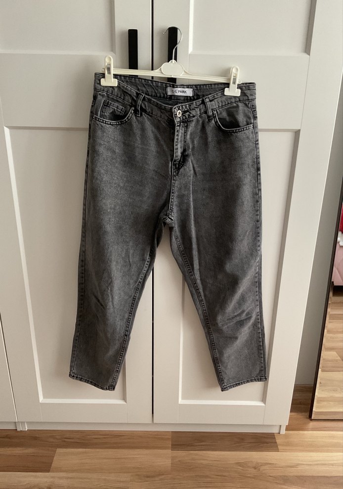 Gri renkte, rahat kesim ve midi boyda olan bu denim pantolon, günlük sokak stili için uygun, zahmetsiz şıklık sunar.