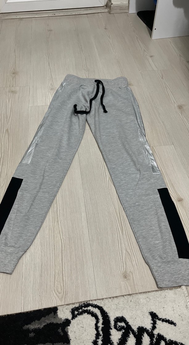 Gri renkli, rahat kesim kadın eşofman. Normal midi boyda, yumuşak sentetik kumaştan spor ve sokak tarzı için uygun.