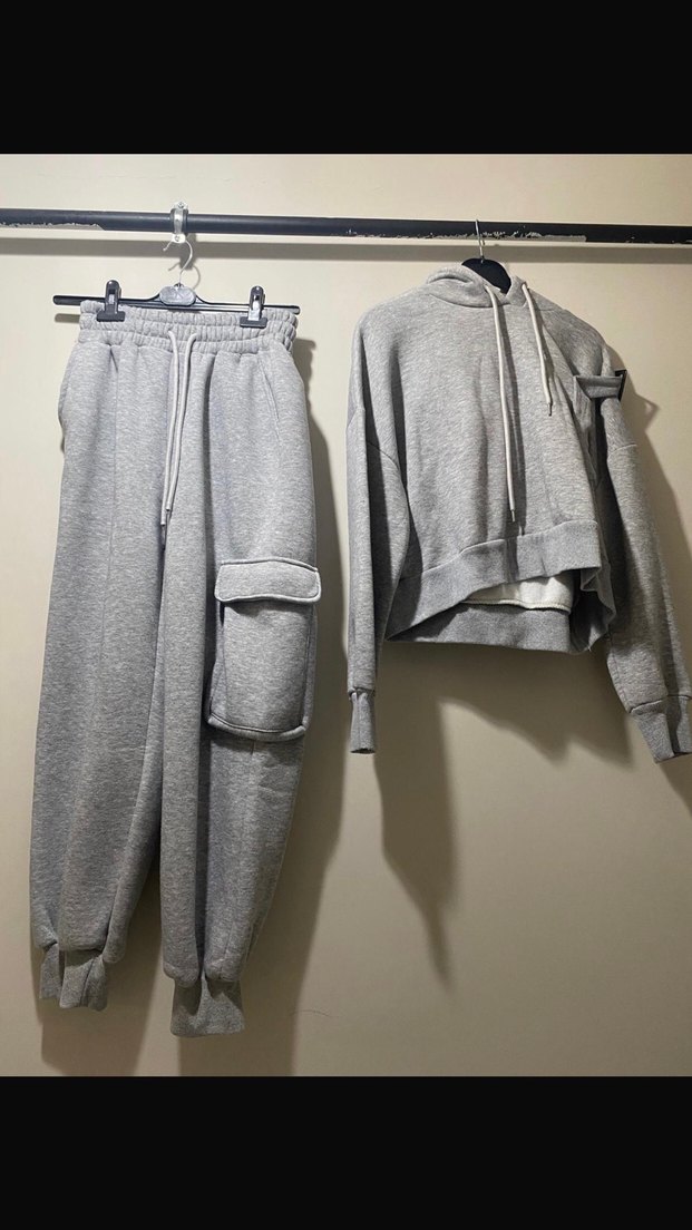 Gri renkte, rahat kesim, lastikli bel ve manşetli, yumuşak ve sıcak kumaştan kadın eşofman altı.