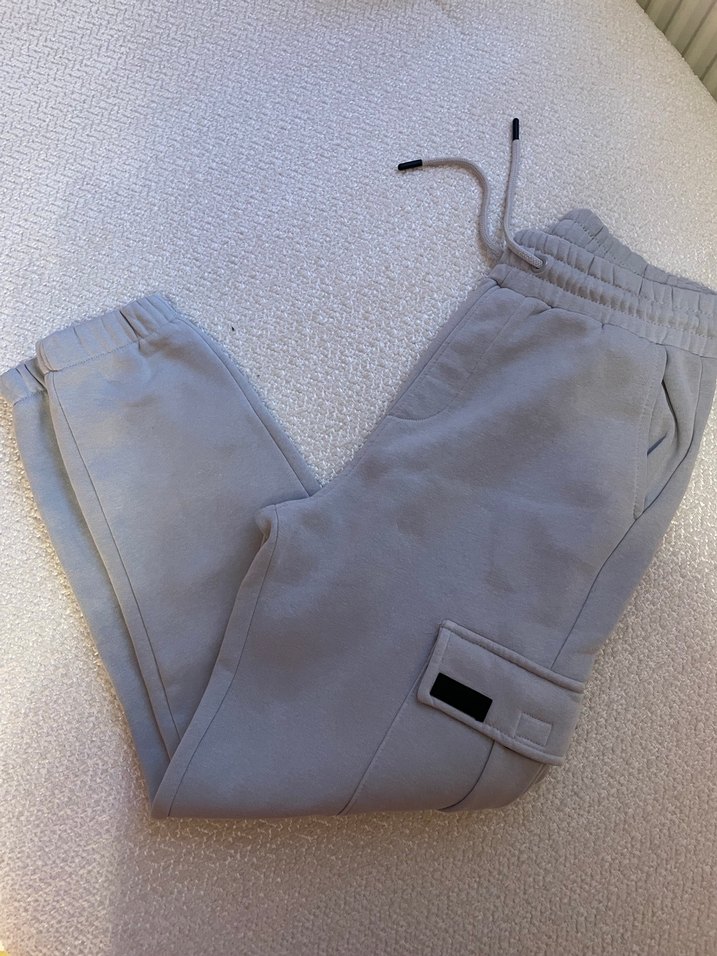 Gri, bol kesim eşofman altı, yumuşak ve sıcak kumaştan. Lastikli bel ve ayarlanabilir ip detaylı, günlük rahat kullanım için uygun.