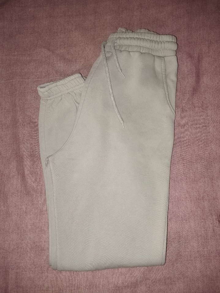 Gri renk, rahat kesim kadın eşofman altı, yumuşak ve sıcak kumaş, lastikli bel ve yan ceplerle günlük kullanıma uygun. İçi şardonludur. Kışlık bir eşofmandır. Önünde küçük bir concealer lekesi vardır.