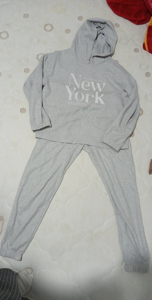 Gri renkte, uzun kollu ve bisiklet yaka, rahat kesim kadın eşofman takımı. Yumuşak ve sıcak kumaştan, sade ve deseniz, "New York" baskılı üst ile şık ve rahat bir stil sunar. ️