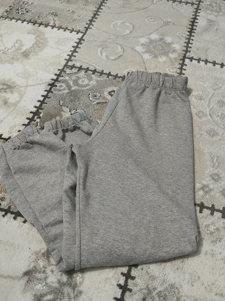 Gri renkte, nefes alabilen keten kumaştan yapılmış rahat kesim kadın eşofman. Midi boy, lastikli bel ve desensiz sade tasarımıyla gündelik kullanıma uygundur.