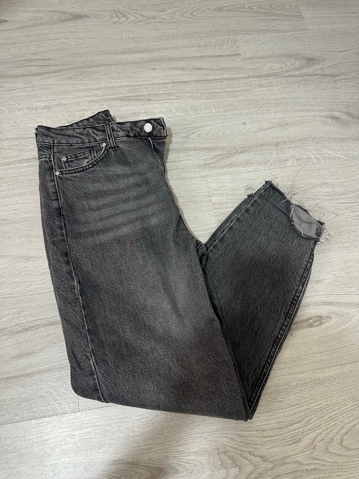 Gri denim kumaştan, düğmeli önü ve rahat kesimiyle kadın kot pantolon. Desensiz, gündelik kullanıma uygun tarzda.