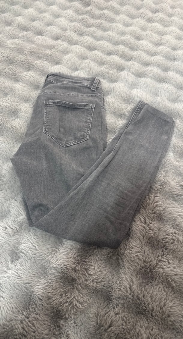 Gri renkte, rahat kesim, normal boyda, desen içermeyen kadın kot pantolon. Günlük kullanıma uygun, kolay kombinlenen rahat bir parça.