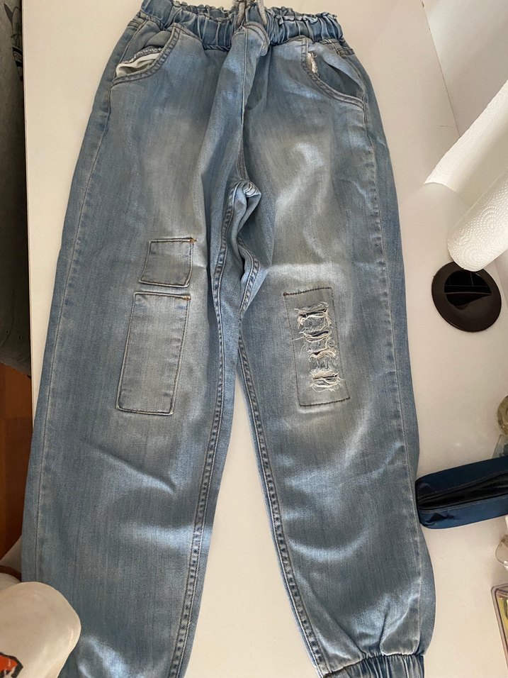 Gri renkli, rahat kesim kot pantolon. Normal boyda ve kemer detaylı, günlük sokak stili için uygundur.