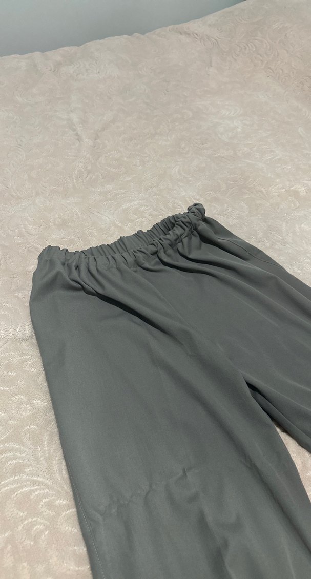 Gri renk, bol kesim kadın kumaş pantolon, uzun boy ve rahat lastikli bel bandıyla günlük kullanım için uygundur.