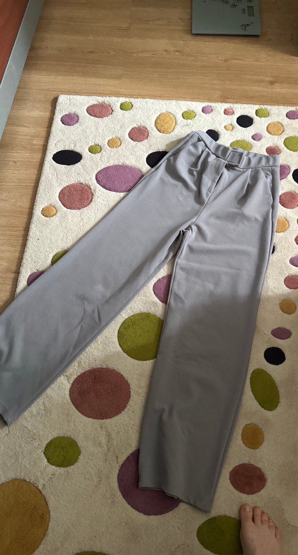 Gri renk, bol kesim ve midi boyda kadın kumaş pantolon. Yumuşak sentetik kumaştan, günlük rahat kullanıma uygun, desensiz ve sade tasarım sunar.