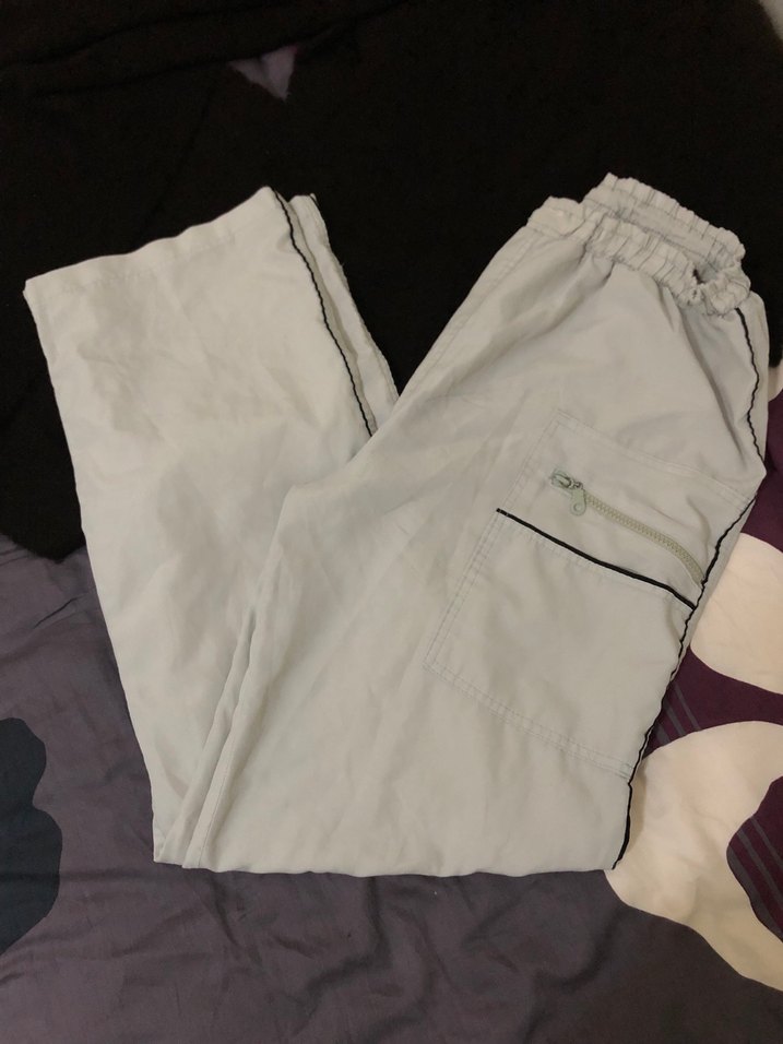 Gri renkte, keten kumaştan yapılmış, rahat kesim ve midi boyda, fermuarlı cepleri olan kadın pantolonu. Defosu vardır fotoğrafını koydum