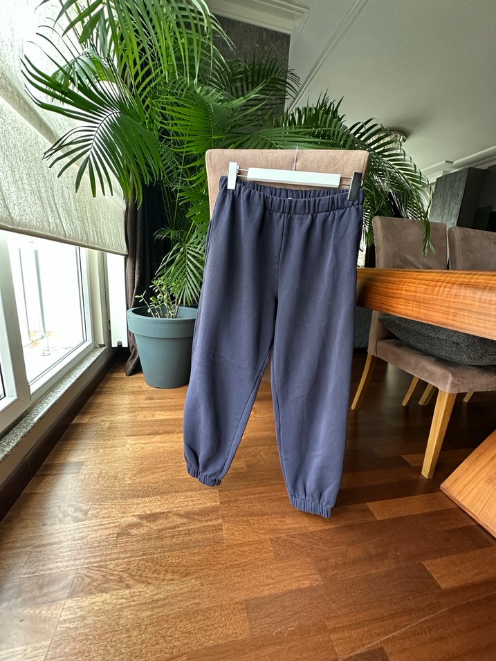 Gri denim kumaştan, elastik bel bantlı, rahat kesim kadın sweatpant, günlük kullanım için zahmetsiz şıklık sunar.