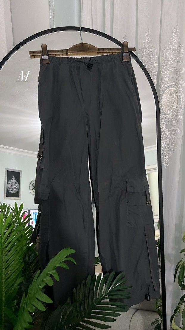 Gri renkli, rahat kesim, kemerli kadın pantolon. Yumuşak sentetik kumaştan, midi boy ve sokak stili tasarım.