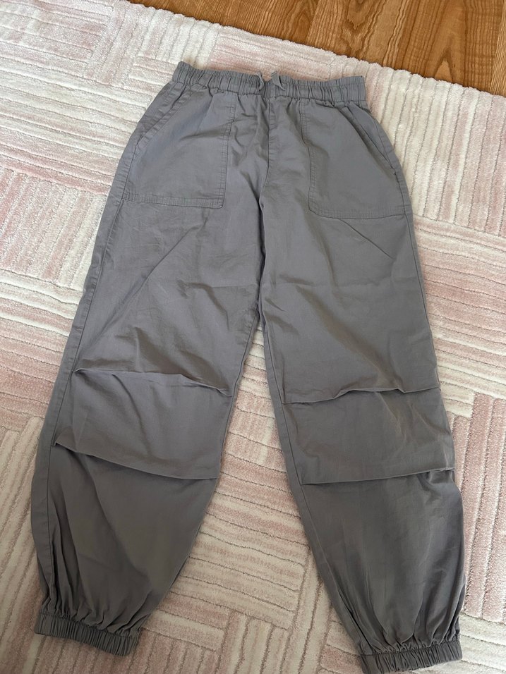 Gri keten kumaştan, rahat kesimli, elastik manşetli ve cepli çocuk pantolonu. Trendy ve şık, günlük dış mekan kullanımı için ideal.