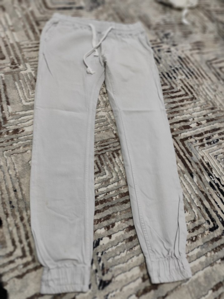 gri keten kumaştan, rahat kesim ve midi boyda kadın pantolon. Bel kısmında bağcıklı lastik ve paçalarda lastik detayları bulunur.
