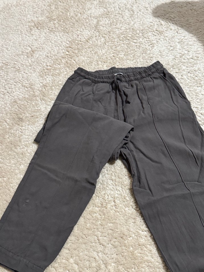 Gri keten, rahat kesim ve lastikli bel detaylı midi boy kadın pantolon, gündelik kullanıma uygun, konforlu ve şık.
