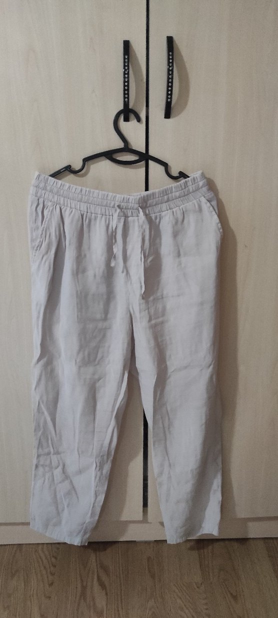 Gri keten kumaştan, rahat kesim ve normal midi boyda, günlük kullanıma uygun kadın pantolon. Lastik bel kısmı rahatlık sağlar.