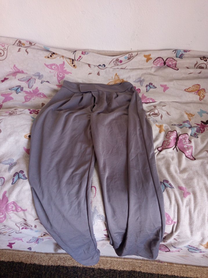 Gri keten midi uzunlukta, rahat kesim ve drapeli tasarıma sahip, desen içermeyen günlük kullanıma uygun pantolon.