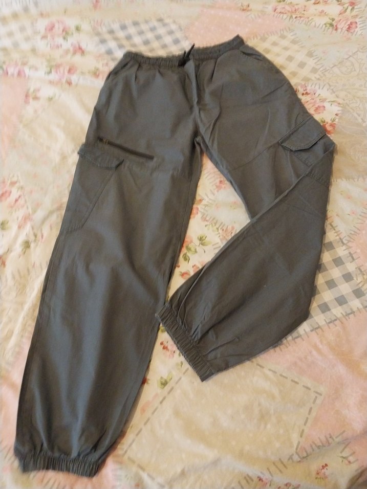 Gri renkte, sentetik kumaştan yapılmış,kargo pantolon. Günlük kullanıma uygun street tarzı.