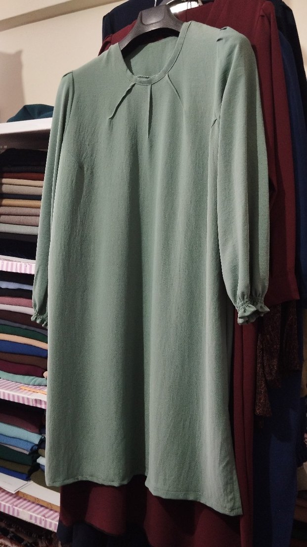 Uzun, bol kesim tunik, uzun kollu ve yuvarlak yaka. , sade gri renkte, rahat günlük kullanım için uygundur.