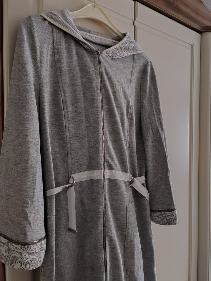 Gri renkte, rahat kesim uzun kaban Yumuşak ve sıcak kumaştan, yakası notalı ve manşetlerde dantel detaylıdır. Günlük kullanıma uygun.40 beden kol kısmında hafif leke var