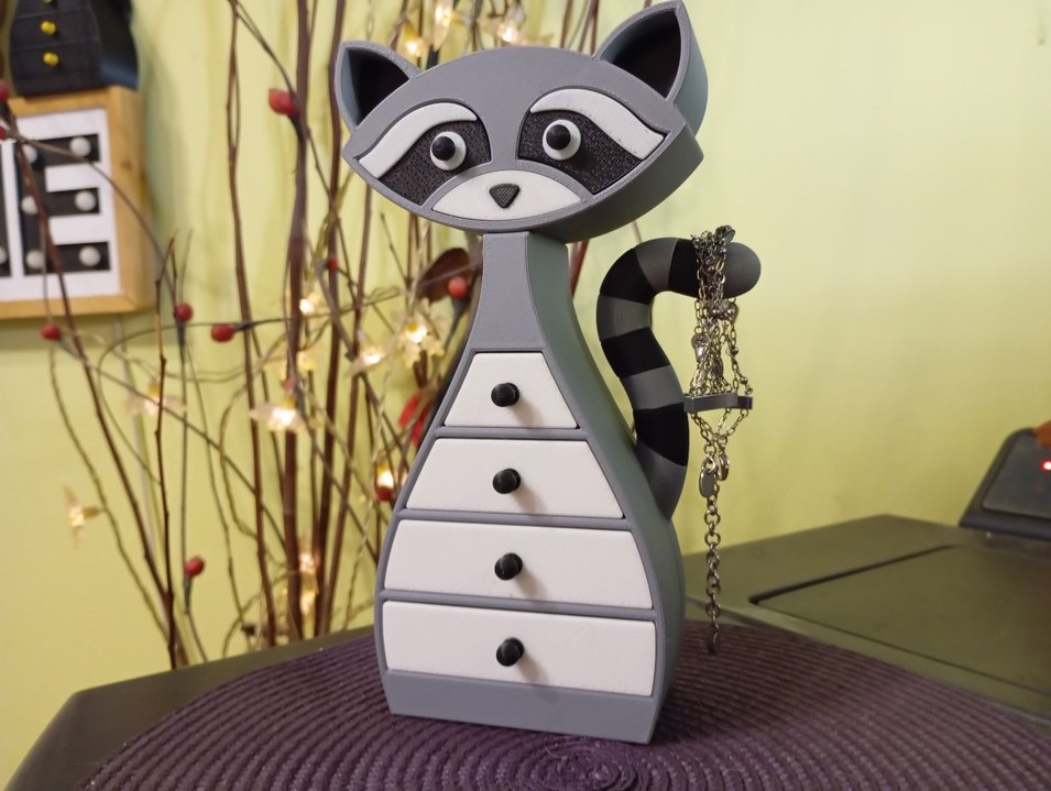 Dört küçük çekmeceli, siyah beyaz detaylı ve çizgili kuyruğu olan gri rakun figürlü takı kutusu.
