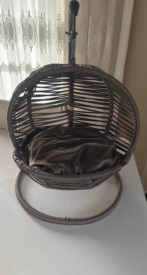 Gri rattan malzemeden yapılmış, yumuşak yastıklı sallanan sepet sandalye. Daire taban ve asma zinciri bulunur.