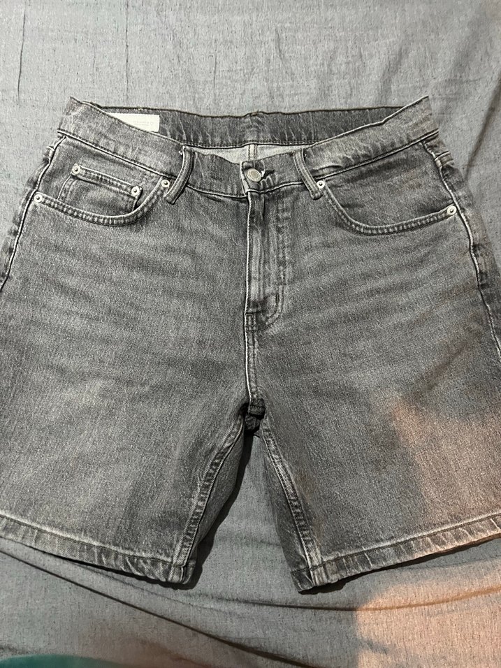 Gri renkli, regular fit ve kemerli bel tasarımlı denim bermuda şort. Midi boyda, desen içermeyen sade stiliyle günlük kullanıma uygundur.
