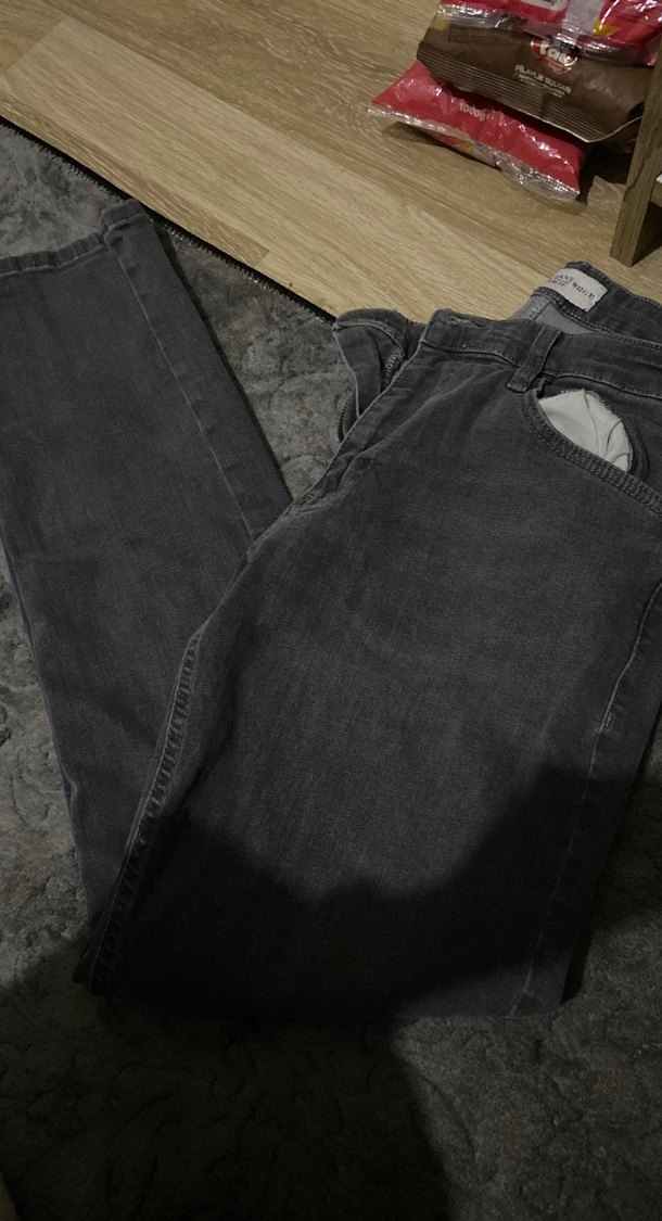 Gri renkte, regular fit ve normal boyda denim erkek pantolon. Tokalı detaylara sahip, günlük sokak stiline uygun rahat bir model.