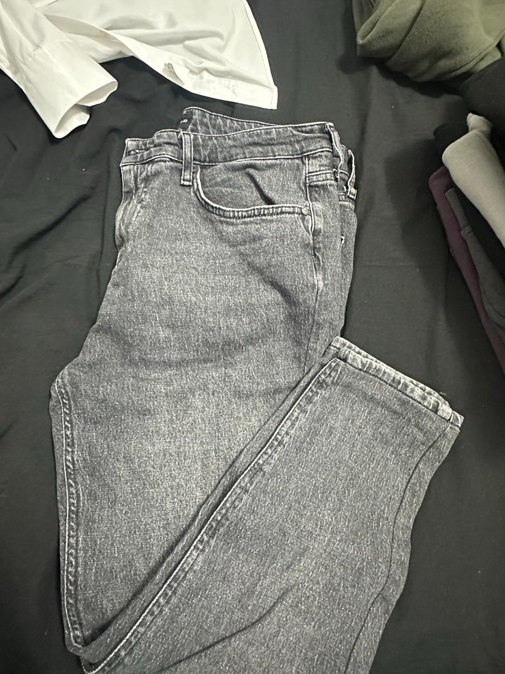 Gri renk, kemerli ve normal boy erkek denim pantolon. Desensiz, günlük ve sokak tarzına uygun rahat bir modeldir.