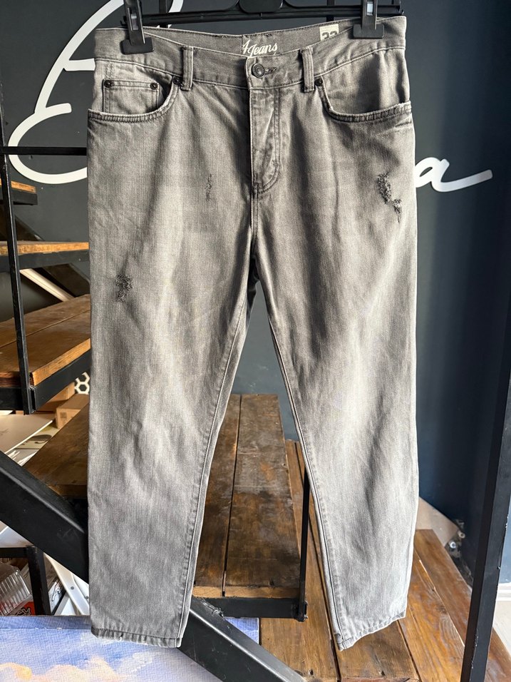 Gri renkte, regular fit ve normal boyda, hafif yıpratma detaylı ve kemerli erkek kot pantolon, günlük sokak stili için uygun.
