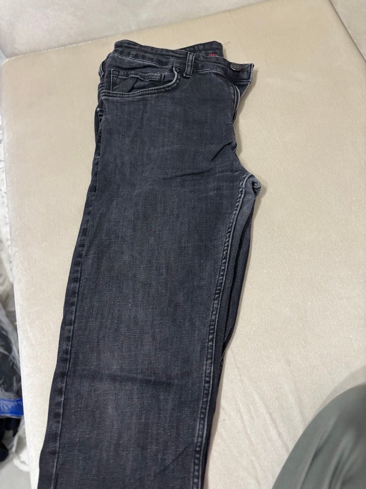 Gri renkli, regular fit ve kemerli erkek kot pantolon. Rahat denim kumaştan, midi boyda, gündelik sokak stili için uygun.