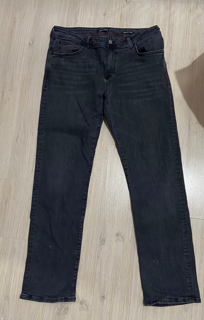 Gri renk, regular fit, kemerli erkek kot pantolon. Normal boyda ve desen içermeyen günlük kullanıma uygun rahat model.